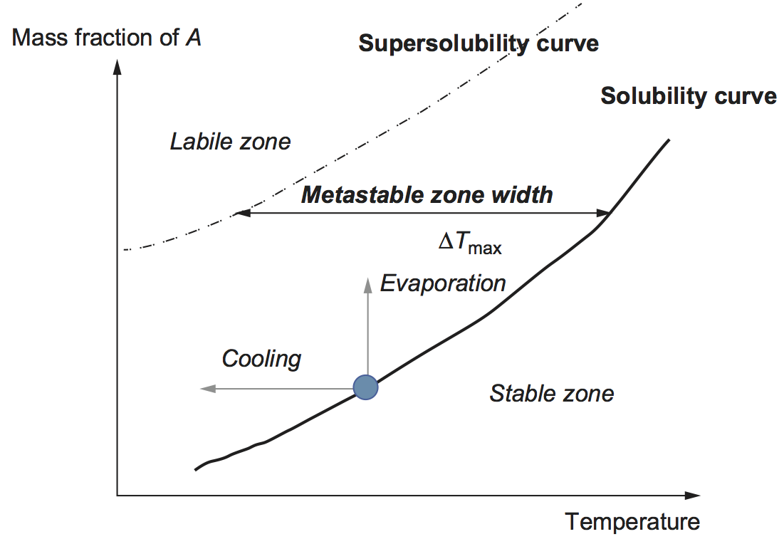 Courbe de solubilité, en fonction de la température : La solution est stable en dessous de cette courbe, et sursaturée au dessus.