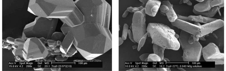 L'effondrement de la bulle près d'un solide peut induire un courant rapide de liquide avec des vitesses pouvant atteindre 100 m/s ( Suslick, 1989[16]). Ce courant liquide peut modifier l'intégration des unités de croissance dans le réseau cristallin. Deux cas sont présentés ci-dessous. Dans le cas du sulfate de baryum (figure ci-dessous), les cristaux croissent en présence d'ultrasons. Les ultrasons induisent une nucléation massive (contact secondaire) ( Gatumel et al., 1998[17]). En outre, des jets de liquide, lors de l'effondrement de la bulle, rendent difficile l'intégration des unités de croissance sur la face du cristal, ce qui modifie son faciès. Dans le cas du sulfate de potassium, les cristaux sont produits sous ultrasons, et leur croissance a lieu en conditions silencieuses ( i.e. sans ultrasons). Les cavités observées sur les faces cristallines (figure suivante) peuvent être créées par ces violents jets de liquide, empêchant l'intégration des unités de croissance et générant des défauts sur la surface des cristaux. Lorsque les cristaux se développent plus tard dans des conditions silencieuses, les faces conservent ces défauts.