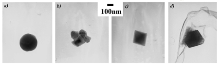 Différentes morphologies d'inclusions d'alumine dans l'acier (MET) : a) globulaire, b) agglomérat, c) octaèdre, d) hexagonal [M. Wakoh, N. Sano, ISIJ International, 47, 5, 627-632 (2007)]