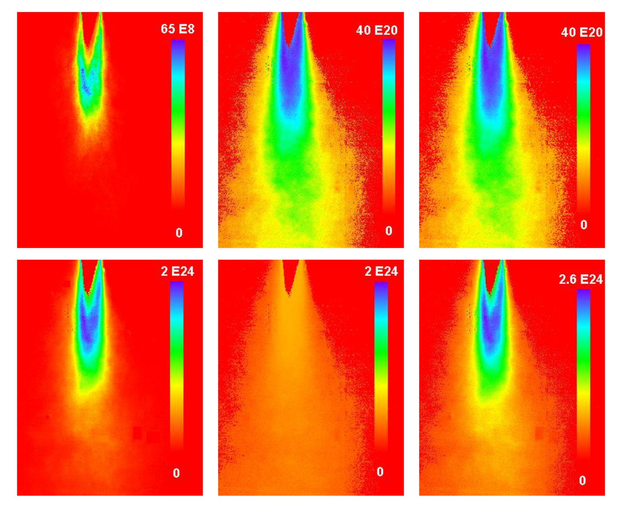 Simulation de la vitesse de nucléation (germes créés/m^3/s) à partir de la visualisation du mélange de traceurs autour d'un jet d'alimentation de 6 mm de diamètre interne dans une cuve agitée ; sursaturation faible (ligne du haut) et forte (ligne du bas) ; colonne de gauche nucléation homogène ; colonne du centre nucléation hétérogène ; colonne de droite nucléation totale.