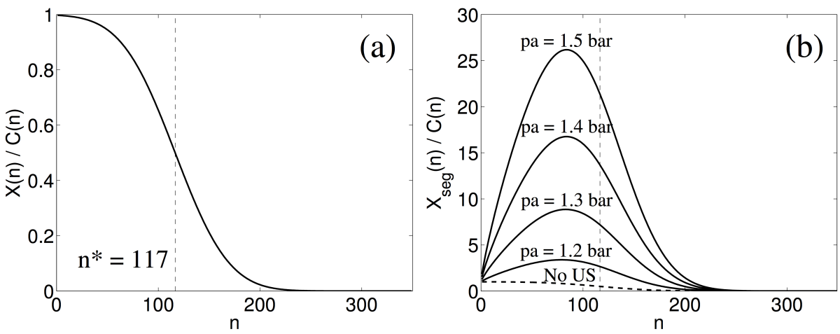 Sur cette base, il a été suggéré que, dans une solution métastable, cet effet devrait sur-concentrer les clusters près de la paroi de la bulle à chaque effondrement de celle-ci, favorisant ainsi leur collision directe, ce qui conduit à l'augmentation du taux global de nucléation. Pour examiner davantage cette hypothèse, la concentration des clusters, alors qu'ils se retrouvent ségrégés du liquide par le mouvement de la bulle, a été évaluée dans les conditions des expériences de cristallisation. Pour quatre amplitudes ultrasonores, la concentration des agrégats ayant des tailles comprises entre 1 et \(3n^*\), à proximité d'une bulle de cavitation inertielle typique, a été calculée pour le sulfate de zinc heptahydraté cristallisé par refroidissement ( Harzali et al., 2011[13]). La sur-concentration des clusters augmente lorsque l'amplitude ultrasonore augmente (figure ci-dessous). Il a été constaté que la ségrégation sur-concentre tous les agrégats, en particulier dans une région située en dessous du cluster critique (\(n^* = 117\)), jusqu'à plus de 20 fois pour une pression acoustique de 1,5 bar (courbe b). Selon la théorie de la nucléation, il est généralement supposé que, dans une solution sursaturée, les clusters changent de taille en raison de l'ajout ou de la perte de monomères, car la concentration des agrégats de plus grandes tailles est très faible ( Kashchiev, 2000[14]). Au voisinage de la bulle, les concentrations des clusters de \(n\)-tailles sont différentes, en raison de la ségrégation, de sorte que toutes les agrégations \(A_n + A_m \leftrightarrows A_{n+m}\) deviennent possibles.