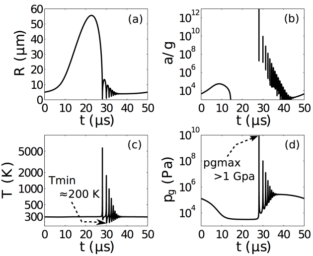 Haute pression jusqu'à un GPa lorsque la bulle s'effondre (figure ci-dessous) ( Virone et al., 2006[2], Grossier et al., 2007[3]) créant une sursaturation élevée, dans le cas où la solubilité du soluté diminue avec la pression ;