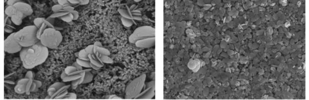 L'effondrement de la bulle près d'un solide peut induire un courant rapide de liquide avec des vitesses pouvant atteindre 100 m/s ( Suslick, 1989[16]). Ce courant liquide peut modifier l'intégration des unités de croissance dans le réseau cristallin. Deux cas sont présentés ci-dessous. Dans le cas du sulfate de baryum (figure ci-dessous), les cristaux croissent en présence d'ultrasons. Les ultrasons induisent une nucléation massive (contact secondaire) ( Gatumel et al., 1998[17]). En outre, des jets de liquide, lors de l'effondrement de la bulle, rendent difficile l'intégration des unités de croissance sur la face du cristal, ce qui modifie son faciès. Dans le cas du sulfate de potassium, les cristaux sont produits sous ultrasons, et leur croissance a lieu en conditions silencieuses ( i.e. sans ultrasons). Les cavités observées sur les faces cristallines (figure suivante) peuvent être créées par ces violents jets de liquide, empêchant l'intégration des unités de croissance et générant des défauts sur la surface des cristaux. Lorsque les cristaux se développent plus tard dans des conditions silencieuses, les faces conservent ces défauts.