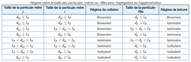 Taille de la particule-mère \(j\) | Taille de la particule-mère \(i\) | Régime de collision | Taille de la particule-fille | Régime de brisure |