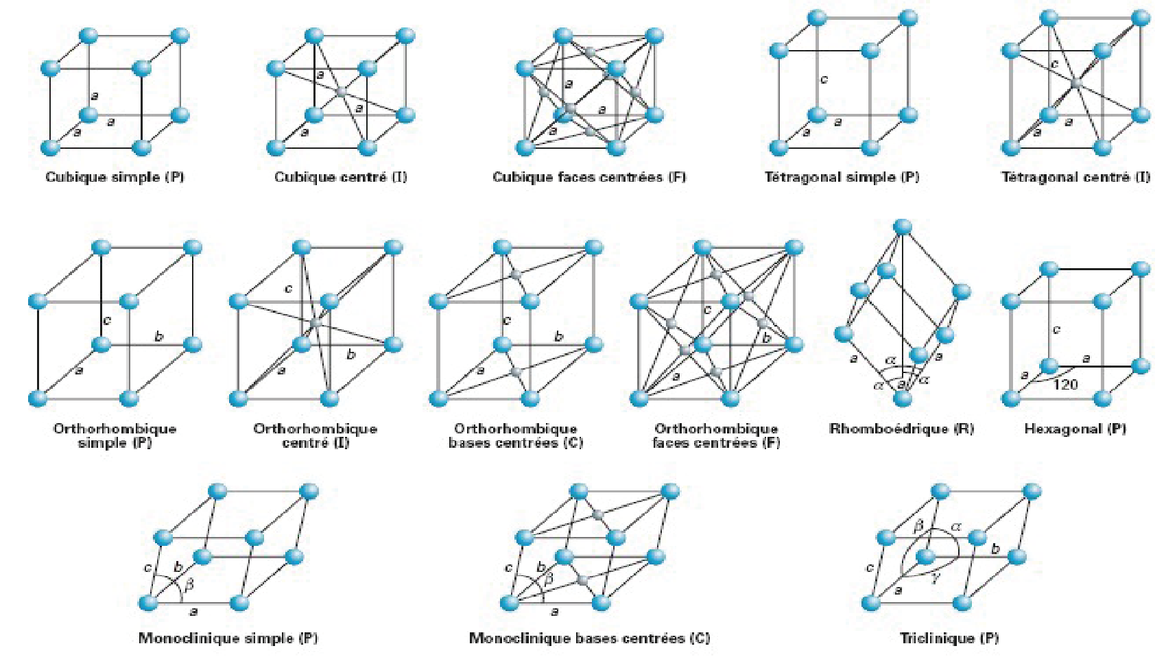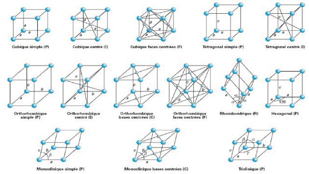 Les cellules primitives sont indiqués par P,R ; les cellules de face centrée par F, les cellule de corps centré par I et les cellules de base centrée par C.