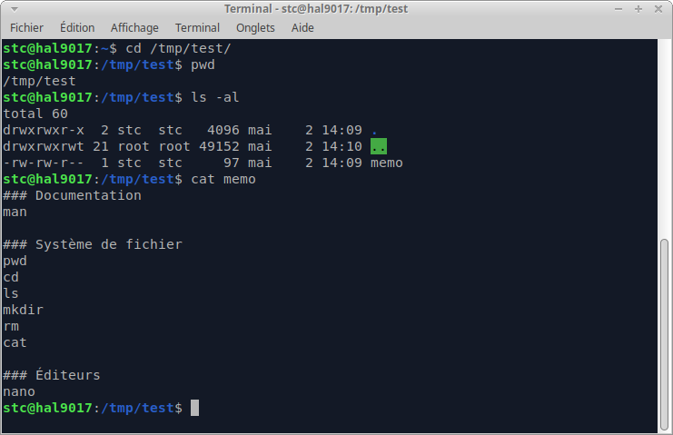 cd /tmp/testse rend dans le dossiertestqui se trouve dans le dossier racine/tmp.pwdaffiche le dossier où on est situé dans le système de fichier.ls -alaffiche la liste des fichiers dans le dossier courant.cat memoaffiche le contenu du fichiermemo.
