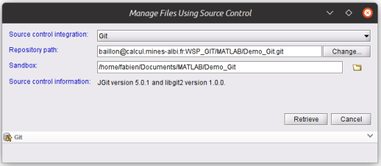 Le dépôt local étant déclaré, le suivi de version sera automatiquement proposé par MATLAB. Ainsi, lors de la création d'un nouveau fichier (par exemple une fonction), une pastille indique l'état git[2] de ce fichier.