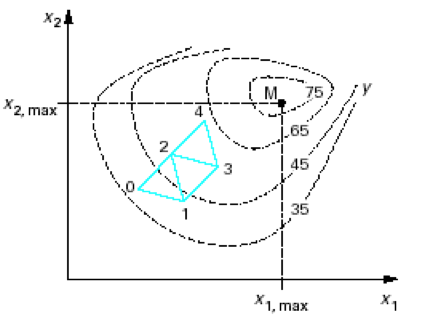La méthode de Nelder et Mead, appliquée à la recherche du minimum d'une fonction objectif avec \(M\) variables de décision, consiste à calculer les coordonnées de \(M+1\) "sommets" d'une figure géométrique dans l'espace de recherche de dimension \(M\) ; cette figure est appelée simplex. La fonction objectif est évaluée et comparée en chacun des sommets du simplex. Le sommet présentant la valeur maximale de la fonction objectif (c'est donc le sommet avec les moins bonnes performances dans un problème de minimisation) va être remplacé par un nouveau sommet pour ainsi former un nouveau simplex. Le principe est que la valeur de la fonction objectif au nouveau sommet soit plus faible. Le nouveau sommet est le symétrique par rapport au centre de gravité des \(M\) autres sommets du nouveau simplex. La fonction objectif est alors évaluée en ce nouveau sommet et le processus est répété. La recherche du minimum va donc se poursuivre itérativement...