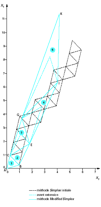 Ci-dessous, un exemple de construction des premiers simplex dans un problème de maximisation à 2 variables de contrôle ; le simplex est donc un triangle (figure géométrique à 3 sommets dans un plan de dimension 2).