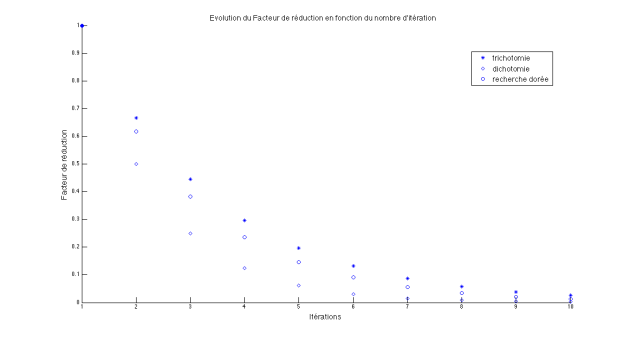 Sur la figure ci-dessous est représentée l'évolution du facteur de réduction des trois méthodes lors des 10 premières itérations sur un exemple donnée. On constate que sur les premières itérations, la méthode de dichotomie permet de réduire le plus le facteur de réduction, mais très vite les différentes méthodes sont très proches. Cependant, il faut en prendre en compte que la méthode de recherche dorée n'évalue la fonction objectif qu'une fois par itération alors que les deux autres méthodes demandent deux évaluations de fonction par itération.