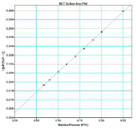 On réalise une analyse basée sur l'adsorption d'azote de façon à déterminer la surface spécifique d'un échantillon de dioxyde de titane. On a appliqué la loi BET sur les valeurs de volumes adsorbés en fonction de la pression relative. Le résultat de l'application de cette loi vous est donné à la suite.
