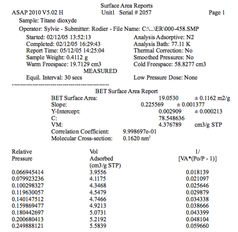 Quant à la précision de l'analyse, on a mesuré ici \(19,02 \times 0,4112 = {7,8}{\, \rm m^2}\) de surface totale, ce qui est un peu faible. On estime que pour analyse à l'azote, la précision de l'analyse est correcte lorsque l'on a mesuré \({10}{\, \rm m^2}\) de surface totale.