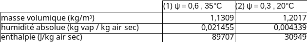 L'enthalpie de cet air est \(H = Ah =3,214.89707 = 297,95\textrm{ kJ}\).