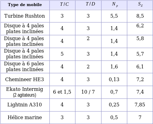 [Nienow, 1996][2] a donné des tables des valeurs du paramètre de Zwietering \[{S}_{Z}\][3] pour un grand nombre de géométries de cuve et d'agitateurs. \[{S}_{Z}\] dépend du rapport du diamètre de cuve \[{D}_{T}\] au diamètre externe d'agitateur \[D\], du rapport de \[{D}_{T}\] à la distance entre le fond de cuve et l'agitateur \[C\], de la forme du fond de cuve et du type d'agitateur, avec une gamme de valeurs s'étageant entre 3 et 15. Les valeurs pour les mobiles d'agitation les plus classiques sont listées ci-après :