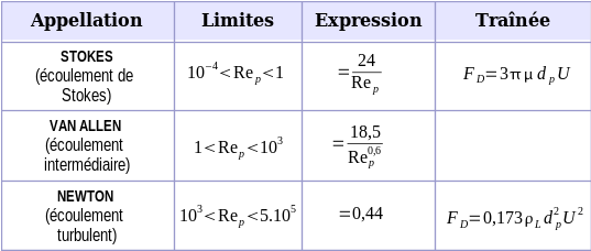 Elle fait apparaître le coefficient de traînée (sans dimension) \[{C}_{D}\][4], fonction lui-même du nombre de Reynolds particulaire \[{\mathrm{Re}}_{p}\][5]. Le tableau suivant présente les différentes lois relatives au coefficient de traînée et à la traînée pour une sphère.