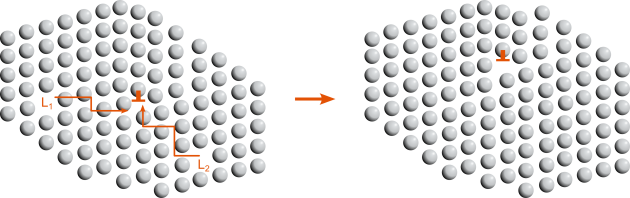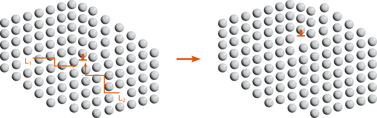 Lorsque la contrainte est suffisamment élevée, un mouvement particulier des dislocations coin peut être activé. Il s’agit d’un mouvement de montée, également lié à la diffusion orientée des lacunes (voir Fig. ci-après). Contrairement au mouvement classique de glissement des dislocations dans les plans cristallins, la montée est assistée par la diffusion de lacunes qui peuvent, dans un mouvement collectif et synergique se déplacer vers le cœur de dislocations. Cet afflux local de lacunes permet alors un mouvement de la dislocation hors des systèmes de glissement usuels.